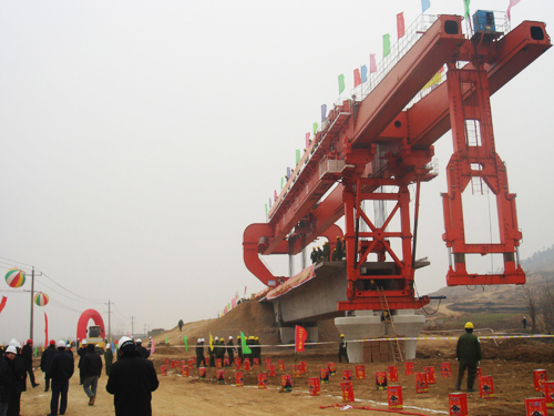 以及生產(chǎn)更新運架產(chǎn)品能架設(shè)跨度40M高速鐵路箱梁的:SXJ1000T/40M一跨式架橋機(配套攀爬式運梁車可以實現(xiàn)過隧道零距離架梁)和攀爬式運梁車。并能對現(xiàn)有32M分體式運架設(shè)備進(jìn)行改造,改造后能實現(xiàn)高低位架設(shè)跨度40M高速鐵路箱梁(高位改造不能過隧道,把原架橋機改造一跨式,把原運梁車增加2軸。低位改造能過隧道架梁,把原架橋機改造一跨式低位,把原運梁車改成攀爬式運梁車并增加二臺喂梁臺車實現(xiàn)過隧道架梁)。